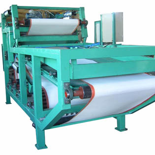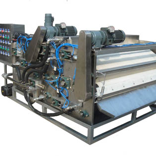 我公司在带式压滤机的基础上,吸取了国外最新机械浓缩,压滤脱水的原理和技术,开发了新型带式浓缩压榨过滤机,组成全新一代浓缩一压滤脱水一体机。污泥经投加凝聚剂后进行充分混合反应流入浓缩段的进料分配器,将污泥均布到倾斜式的浓缩段上,并在泥耙的双向导疏和重力作用下,污泥随着滤布的移动,迅速脱去污泥的游离水。重力脱水后浓缩污泥反转机构将污泥输送至带式压滤机的重力脱水段进一步脱水。然后喂入。S。形压榨段,在。S。形压榨段中,污泥被夹在上、下两层滤布中间,经若干个不同直径辊筒反复压榨,促使泥饼再一次脱水,最后通过刮刀将泥饼刮落,而上下网带在运行过程中不断的地被自动清洗。该机具有生产能力大,污泥脱水率高的特点。被广泛的应用于市政污泥、尾矿、酒精废液、洗煤厂煤泥、造纸厂污泥、屠宰厂污泥、洗车厂污泥以及各类污水处理工艺中产生的污泥。